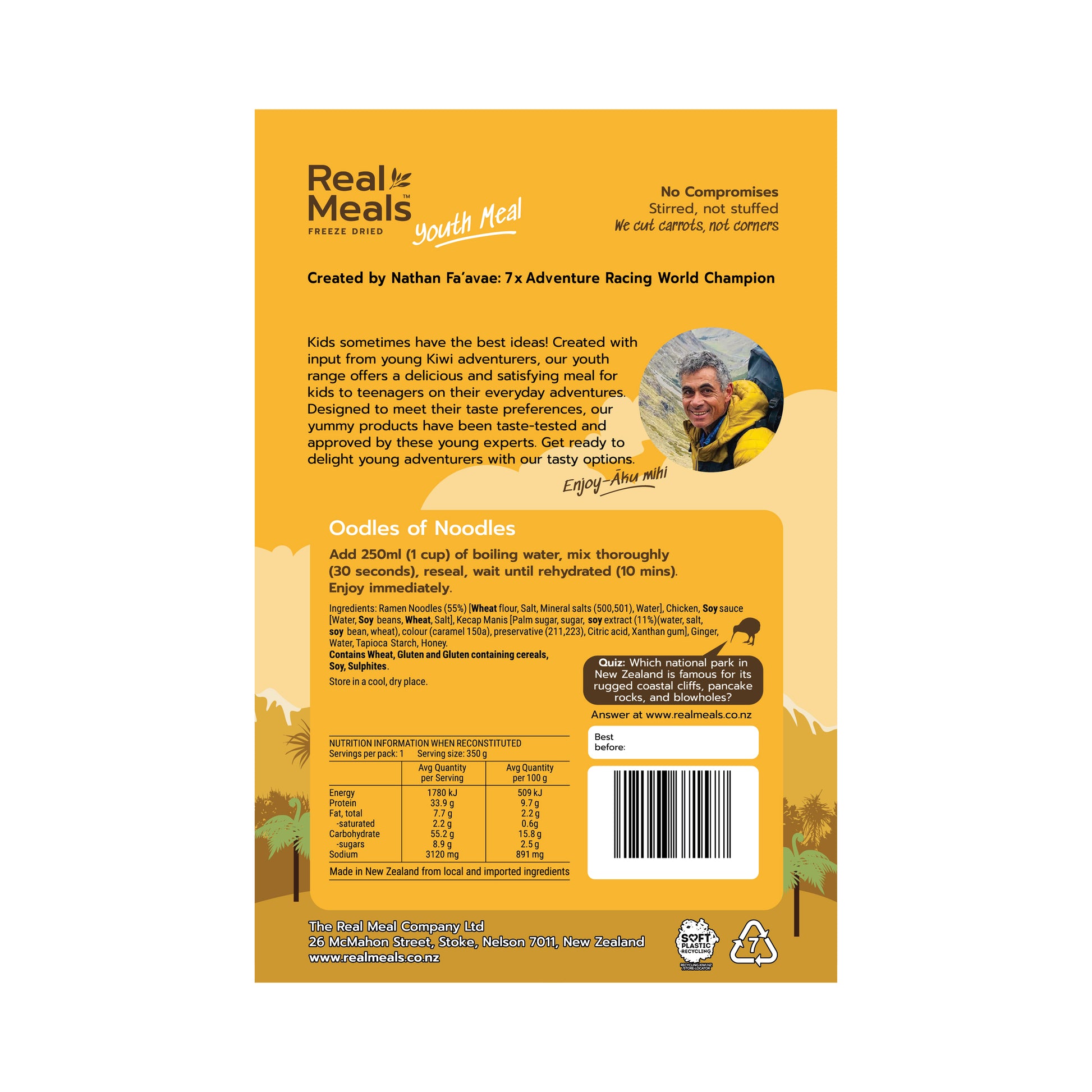 Ramen noodles (wheat flour, salt, mineral salts [500, 501], water), Chicken, Soy sauce (water, soybeans, wheat, salt), Kecap manis (palm sugar, sugar, soy extract [water, salt, soybean, wheat], colour [caramel], preservative, citric acid, xanthan gum), Ginger, Water, Tapioca starch.